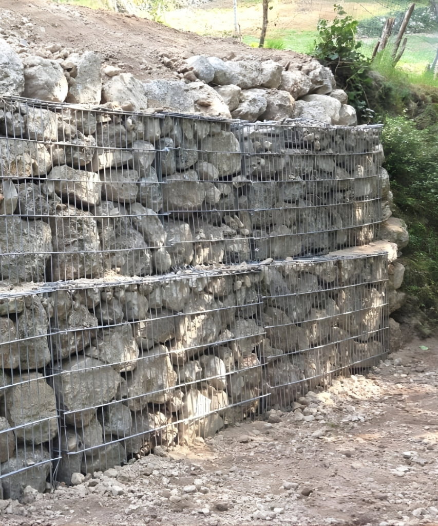La tecnica garantisce semplicità e velocità di messa in opera, riducendo significativamente i tempi di cantiere. Un aspetto fondamentale è la possibilità di riutilizzare il materiale lapideo presente in loco, minimizzando l’impiego di pietra di cava e abbattendo i costi di trasporto. I gabbioni elettrosaldati assicurano inoltre durabilità strutturale garantita nel tempo, resistendo agli agenti atmosferici e ai movimenti del terreno.